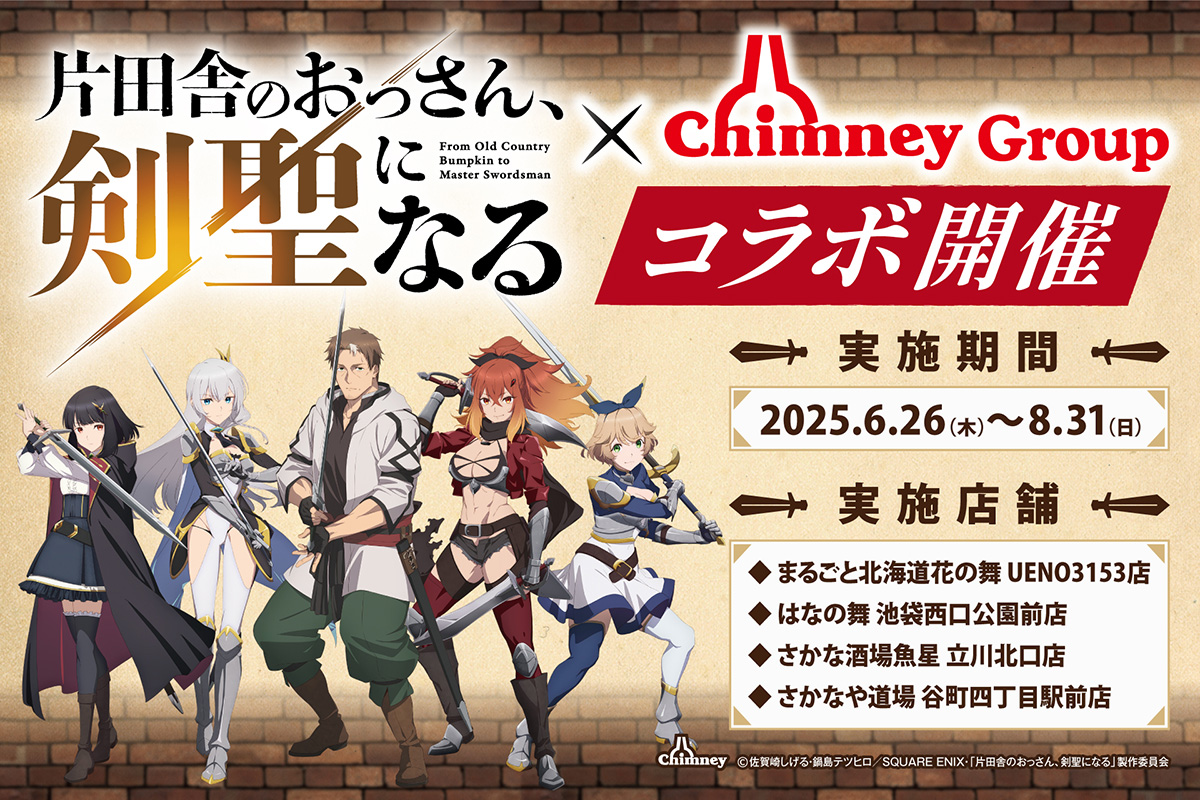2025年6月26日(木)よりチムニーグループの海鮮居酒屋「まるごと北海道 花の舞 UENO3153店」「はなの舞 池袋西口公園前店」「さかな酒場 魚星 立川北口店」「さかなや道場 谷町四丁目駅前店」の4店舗にて、TVアニメ「片田舎のおっさん、剣聖になる」とのコラボレーションキャンペーンを開催が決定!