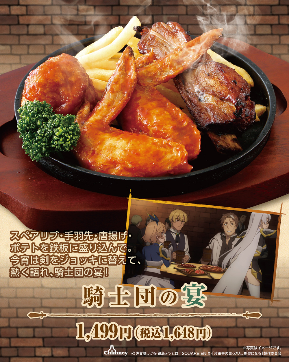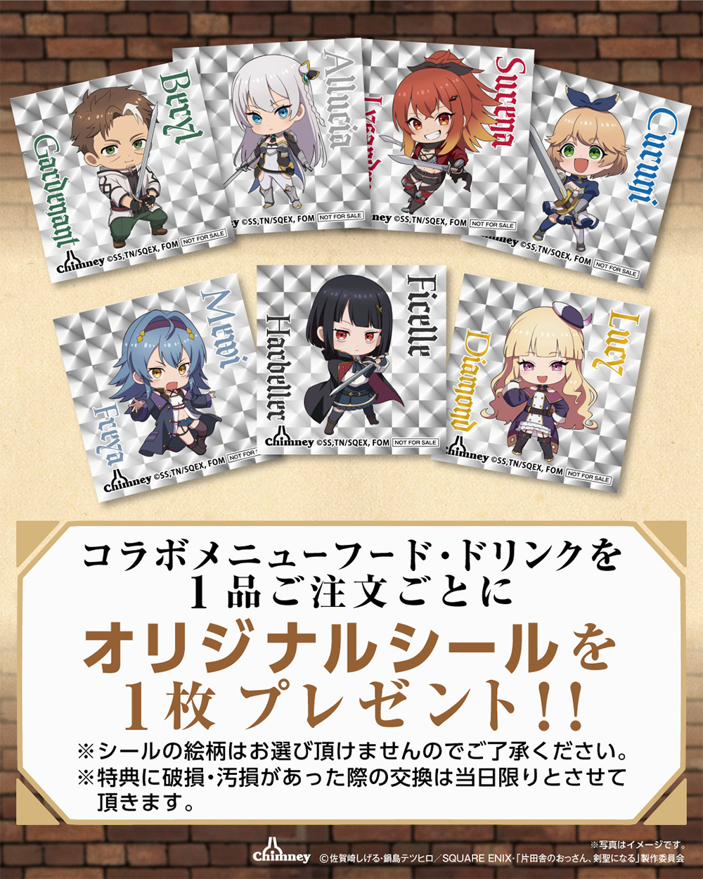- コラボメニュー・ノベルティのご提供数には限りがあるため、お電話またはWebからのご来店予定店舗のご予約をお勧めしております。ご予約の際、「片田舎のおっさん、剣聖になるコラボ利用」の旨を添えていただけると比較的スムーズにご案内が可能です。