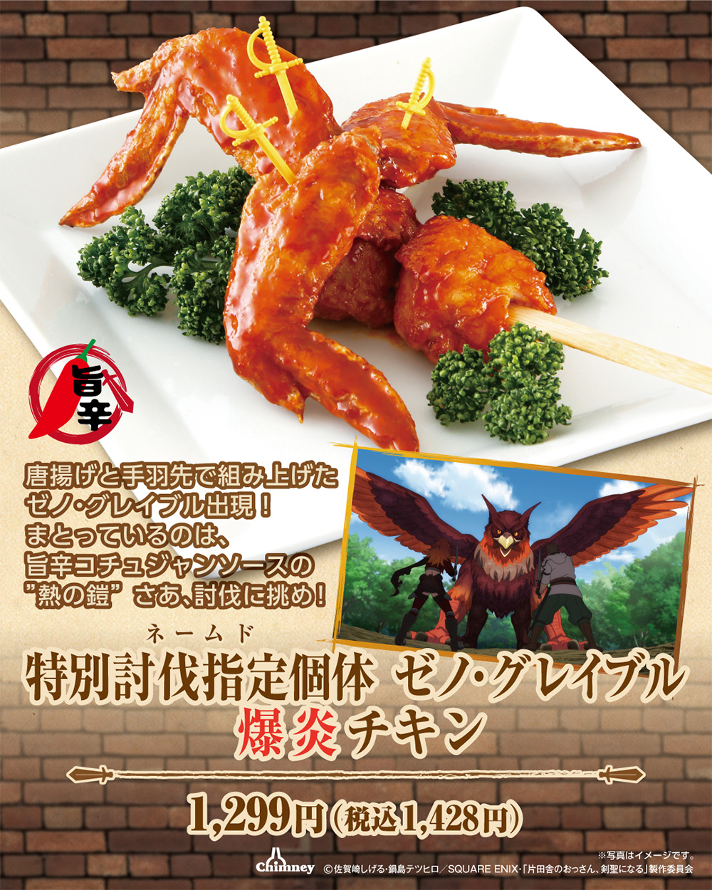 ゼノ・グレイブル 爆炎チキン 1,299円(税込1,428円) 唐揚げと手羽先で組み上げたゼノ・グレイブル出現!まとっているのは、旨辛コチュジャンソースの”熱の鎧”。さあ、討伐に挑め!