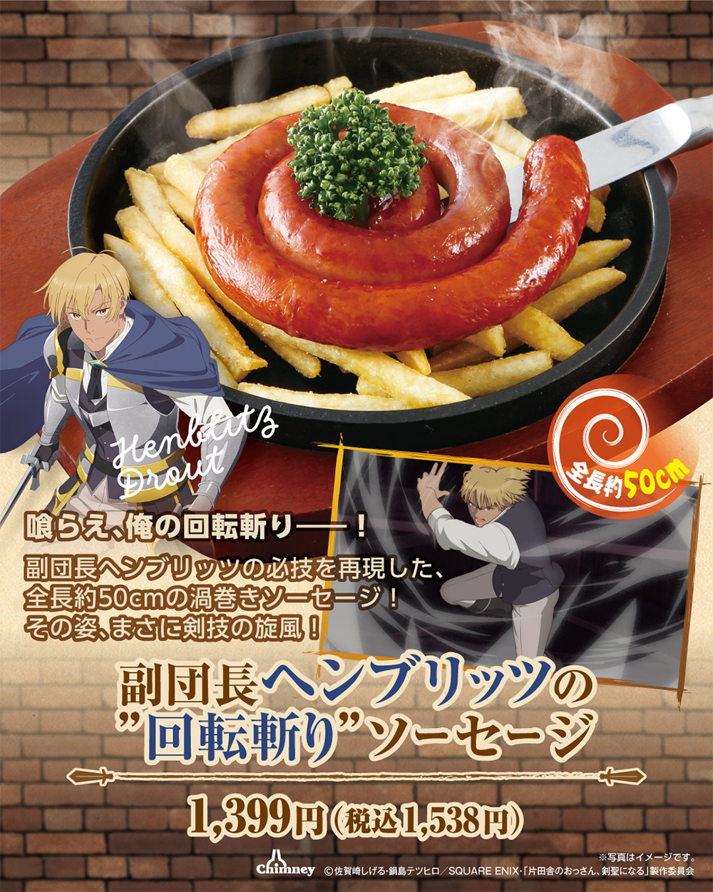 ”回転斬り”ソーセージ 1,399円(税込1,538円) 喰らえ、俺の回転斬り――!副団長ヘンブリッツの必技を再現した、全長50cmの渦巻きソーセージ!その姿、まさに剣技の旋風!